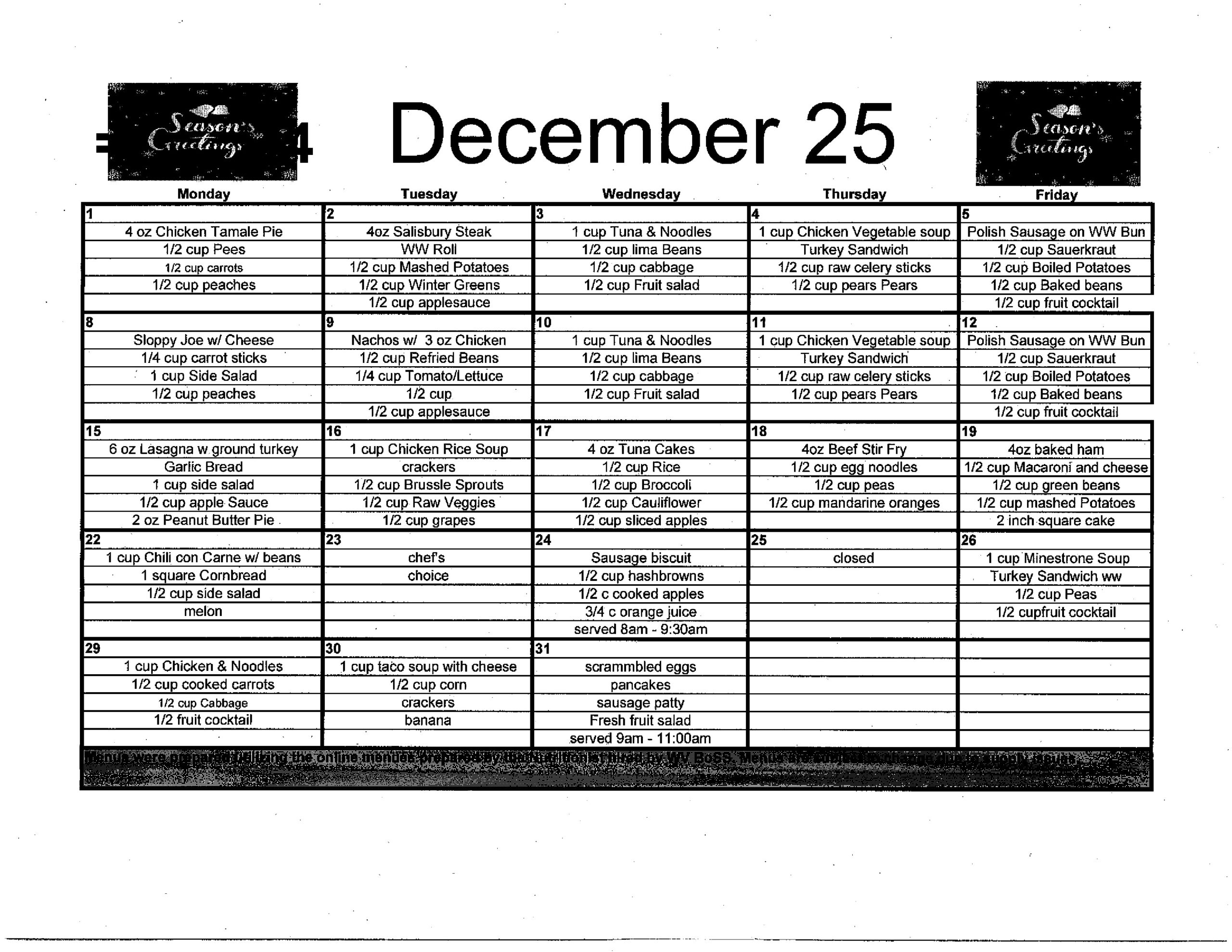 HERE for a printable PDF version of the December 2025 Nutrition Menu